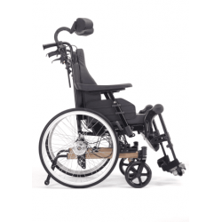 Équipement: profondeur d'assise réglable en continu Dossier Laguna 2, réglable en hauteur | Coussin d'assise Mistral, 2 épaisseurs | Poignées de poussée réglables en hauteur | Repose-jambes réglable en angle, genouillères et mollets inclus | Réglage du siège et du dossier par ressort à gaz | accoudoirs réglables en hauteur | Extension de largeur d'assise | pneus increvables | Roues motrices 24 pouces, pneus avant 200 x 45 souples | Handrims aluminium | Anti-basculement | Sangle de talon | Repose-pieds à angle et profondeur réglables