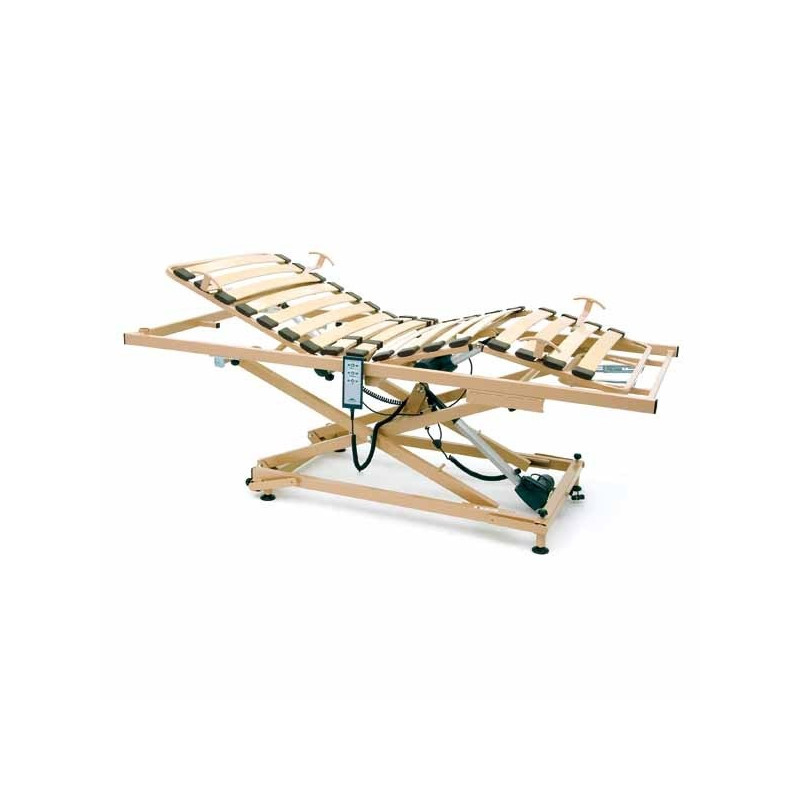 Réglages individuels du dossier, des jambes et du niveau. Le niveau est réglable de 29 à 74 cm. Dimensions 140 x 200 cm. (Rallonge de 20 cm en option.)Cadre métallique sur 4 pieds réglables. Livré avec 4 retenues de matelas de 7 cm de hauteur et extensibles sur 5 cm en largeur. Système de motorisation LINAK avec possibilité de verrouillages de fonctions sur la commande. Charge max. 250 kg.